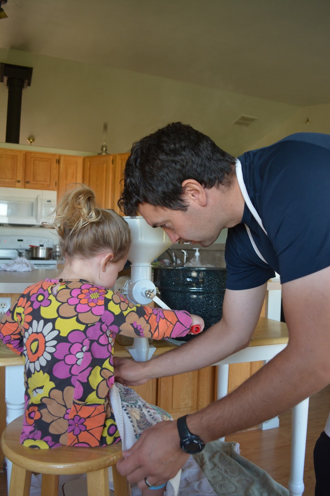 Daddy covering Em's legs so she wouldn't get burned by splashing Apple Sauce. Ouch!
